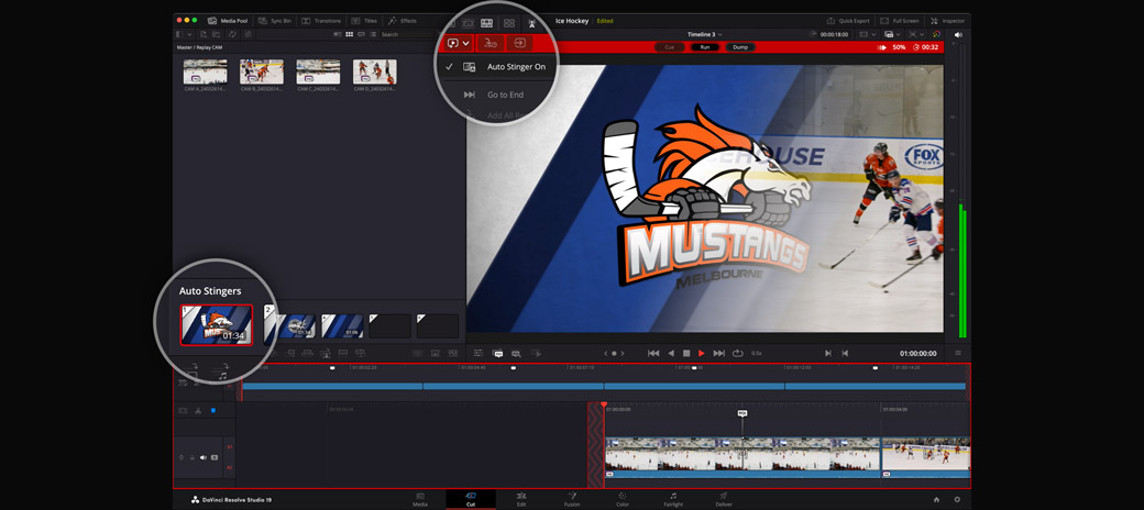 As produções ao vivo costumam usar automação complexa para as vinhetas, ou stingers. Mas com stingers automáticos integrados, o DaVinci Resolve reduz a carga de trabalho, pois é como ter automação embutida. O DaVinci faz tudo! Pressione o botão de stingers automáticos e ele reproduzirá a vinheta selecionada quando os botões de execução e descarte forem pressionados. Ele também envia o canal alfa na vinheta à saída SDI de chave do hardware. Selecionar o botão de execução inicia a vinheta e depois reproduz o clipe. O botão de descarte executa a vinheta novamente e depois encerra a reprodução. O descarte pode sofrer um pequeno atraso se uma edição tiver acabado de ocorrer; no entanto, pressioná-lo duas vezes interrompe a reprodução imediatamente. Os stingers automáticos fazem com que cada replay pareça verdadeiramente profissional.