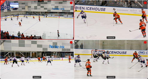 Você pode clicar nos ângulos de câmera para alternar entre as câmeras enquanto estiver no ar. Em seguida, a câmera selecionada é enviada para a saída de vídeo. É como ter um switcher de vídeo ao vivo integrado ao visualizador.