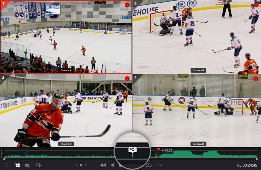 É comum assistir à ação e esperar que algo interessante aconteça para poder configurá-la para replay. Se você estiver conectado ao hardware Blackmagic Desktop Video, ao selecionar a visualização de entrada, será exibida uma prévia ao vivo da entrada SDI ou HDMI no visualizador do DaVinci Resolve, que oferece uma visualização em tempo real sem latência. Uma boa entrada é a saída de multivisualização de um switcher ATEM. Além disso, a visualização de entrada faz a captura instantânea do código de tempo da entrada de vídeo ao definir o POI. Assim que você definir o POI, o visualizador alternará para a mídia multifonte e posicionará o ponto POI conforme ele é carregado do armazenamento. É quase instantâneo! Agora, basta rolar a mídia, selecionar uma câmera e iniciar o replay.