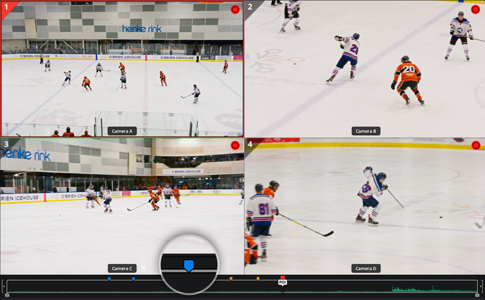 Durante a execução, a multivisualização permite conferir outros ângulos de câmera. Selecione um novo plano pressionando uma tecla de duração e uma tecla de câmera. A reprodução se posiciona segundos antes do POI e reproduz o novo ângulo.