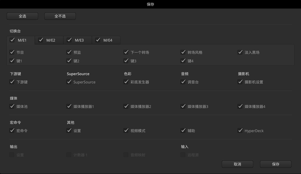 ATEM Constellation 8K能随时快速保存切换台设置,供您即时调用!切换台状态会被保存为XML文件,因此您还可以对其进行编辑加以更改。如果您从其他ATEM切换台转换到ATEM Constellation 8K,可以使用来自其他任何ATEM切换台机型的XML设置,甚至ATEM Mini XML设置文件,就是这么简单!您可以根据需要在任何时候保存切换台状态,也可以对ATEM Software Control进行设置,让它每隔一段时间执行自动保存,较早的文件版本也都会完整保留下来。保存切换台状态时,您不仅能保存其各项设置,还能保存媒体池中的所有内容!