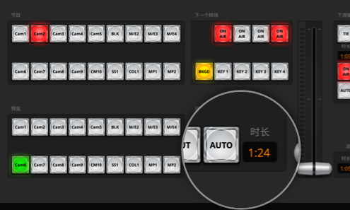 您可以自定义转场时长,然后使用Auto按钮获得流畅而准确的定时转场。当启用Auto按钮时,切换各路信号源将自动添加画面转场。Auto按钮可用于混合、浸入、划像、DVE等众多效果!当设置为节目/预监切换风格时,它还可以自动更改为触发转场。