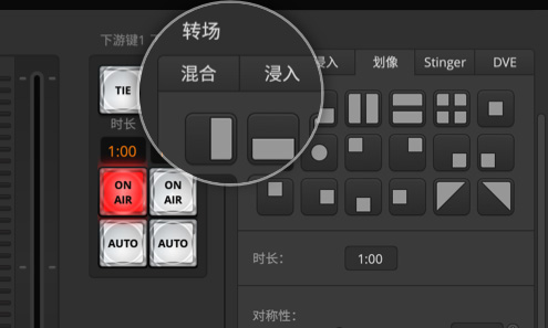 转场控制区块可提供快捷控制,让您快速选择转场风格,并在现场制作的时候即时设置时长。您可以先选定混合、浸入、划像或者甚至DVE转场,当需要切换信号源的时候再使用Auto按钮立即触发转场,或使用渐变推杆全面手动转场!