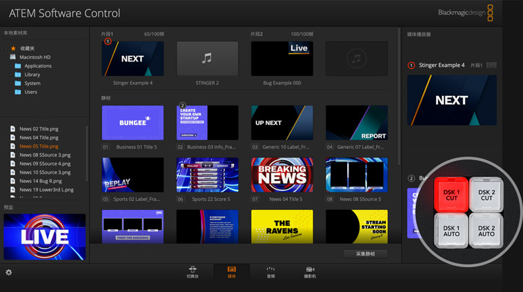 内置的媒体池能存储广播级高品质图文和动画素材,并可通过媒体播放器播放。媒体播放器会作为独立信号源出现,您无需因为使用图文而占用任何一路SDI输入。为了保证质量,所有媒体都支持带Alpha通道的RGB色彩空间,以实现透明度和图层处理。媒体池可容纳20个HD或Ultra HD分辨率静帧。根据不同型号而言,动画和Stinger的动态图形片段可存储多达720帧720HD影像,360帧1080HD影像以及90帧2160 Ultra HD影像。您可以使用ATEM Software Control上传及管理媒体,您还可以在Adobe Photoshop中准备图文,然后使用免费的ATEM Photoshop插件下载到媒体池。