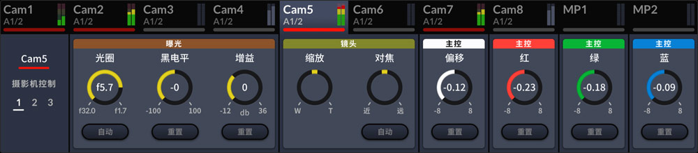 进行现场制作时,各机位画面之间的色彩匹配非常重要,因为当您切换不同摄影机画面时,它们必须具备一致的观感。ATEM Television Studio拥有内置摄影机控制,但如果您添加了专用的ATEM Camera Control Panel,就可以通过与广电行业标准相同的控制风格调整摄影机。每个摄影机控制窗口都配有一块LCD屏幕,并配备按钮和旋钮用于现场摄影机调整,让您全面掌握每台摄影机的参数。控制面板上的大型摇杆可直接调整光圈,并可通过旋转操作来设置黑电平。此外,控制面板还设有红色、绿色、蓝色旋钮,可对摄影机色调进行精细的调整!
