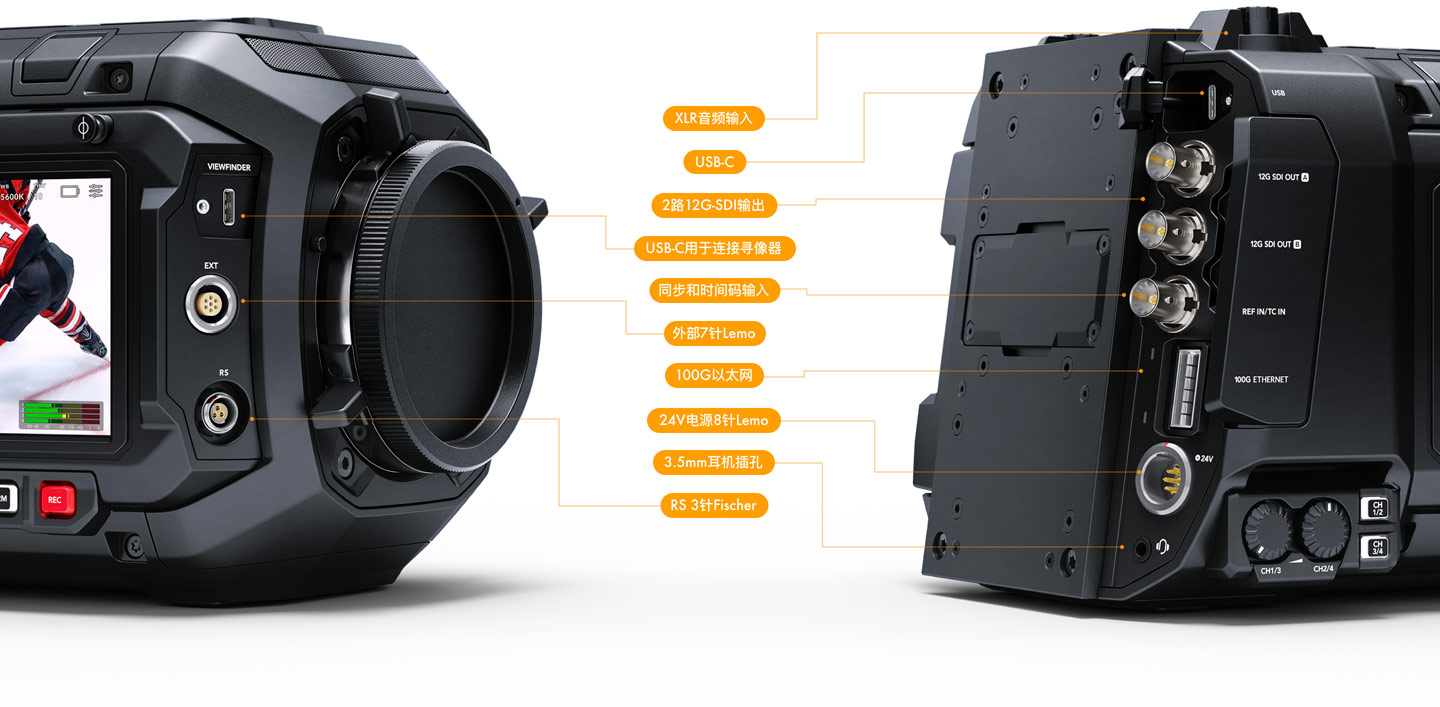 Blackmagic URSA Cine的设计旨在满足高端制作的各类需求。其机身以高强度镁合金和轻质碳纤维聚碳酸酯复合材料打造而成,能让您在拍摄现场快速移动。触感柔软的背光按钮让您在任何光线条件下都能对各项控制一目了然。摄影机搭载一块5英寸翻折式触摸屏,可用于查看镜头并进入各项摄影机设置,机身另一侧还设有一个专门的辅助区,配有5英寸LCD屏幕和全面的摄影机控制!标准LEMO和Fischer连接器可实现摄影机远程控制,同时为镜头马达和其他配件提供电源。除此之外,还有12G-SDI输出、10G以太网、USB-C、XLR音频等接口!