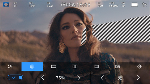 URSA Cine只要通过简单的点触操作就能开启或关闭不同的监看工具!点按监视器图标可调出叠加信息选项,从而切换和调整不同设置。您可以调整查看亮部或中灰部分曝光程度的斑马纹设置、对焦辅助工具、帧导栏、网格以及更多选项!