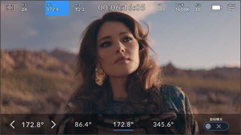 URSA Cine拥有直观易用的快门角度控制,让您事半功倍!您可以用这些选项来控制运动模糊的程度或补偿不同的照明条件,还可以选择常用快门角度、手动键入角度,或者使用URSA Cine为您自动建议的防闪烁快门角度!