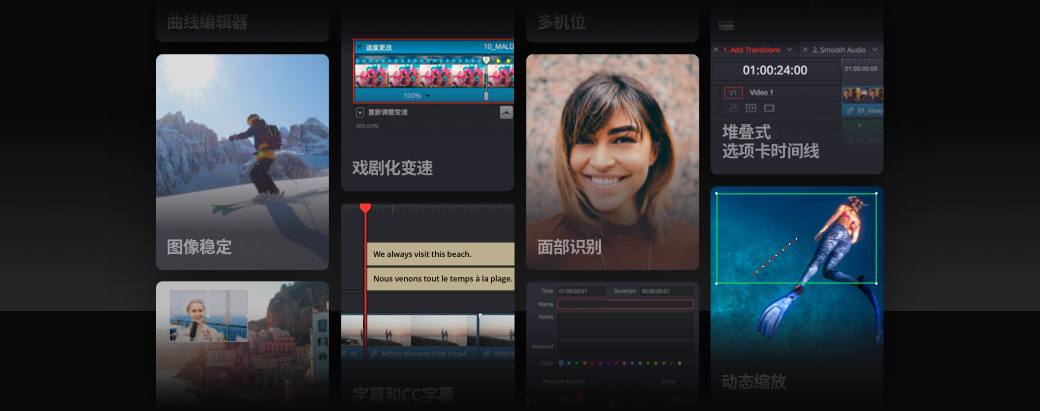 熟练掌握基本知识后,剪辑页面中数量庞大的功能集能帮助您以全面的创意控制打造出精彩作品!您可以创建出精致的最终混音,添加变速效果,使用先进的剪辑和修剪工具制作更为复杂的项目,转录片段制作字幕或进行基于文本的编辑,使用面部识别功能管理片段,创建画中画效果,以及处理多机位素材等!同时,DaVinci Resolve还广泛兼容一系列视频和音频文件类型,让您能通过多种渠道来管理素材,是从事大型项目制作时的理想选择。