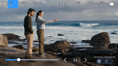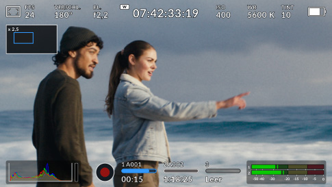 Beim Kadrieren von Shots mögen Overlays wie das Histogramm und die Audiopegelmeter ablenken. Um sie zu verbergen, wischen Sie auf dem LCD nach oben oder unten. Ist Ihr Shot kadriert, wiederholen Sie die Geste, um die Overlays zurückzuholen.