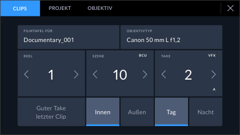 In der Postproduktion erleichtern Metadaten das Sortieren und Verarbeiten von Bildmaterial. Mit dem Blackmagic OS können Sie zusätzliche Infos wie den Einstellungstyp oder Projektnamen eingeben. Ein Wisch nach rechts oder links ruft die Filmtafel auf.