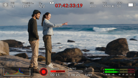 Anhand des „Monitoring“-Tabs entscheiden Sie, was über den eingebauten LCD-Touchscreen und den primären SDI-Ausgang angezeigt wird. Overlays lassen sich für jede Ausgabe individuell aktivieren. Senden Sie so einen Cleanfeed, Zebra, Fokussierhilfen, Bildrandmarkierungen und mehr mit einer oder allen Ausgaben. Sie können sogar die Auflösung und etwaige LUTs für jede Ausgabe separat wählen. Und das Beste: Für den Kinematografen und den Regisseur können Sie unterschiedliche Statustexte festlegen. Senden Sie diese Signale dann an den SDI-Ausgang, damit die richtige Person auch die richtigen Informationen zu sehen bekommt!