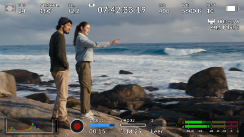 Das HUD birgt wichtige Daten wie Framerate, Blende, Timecode, Cloud- und Streaming-Status, Verschlusswinkel, Weißabgleich, ISO, Tonpegel und mehr. Durch Auf- oder Abwärtswischen rufen Sie das HUD auf oder verbergen es. Beispielsweise passen Sie Einstellungen wie den Weißabgleich durch einfaches Berühren der WB-Anzeige an. Oder Sie tippen die Audiopegelmeter an, um die Tonpegel zu justieren. Alles ist interaktiv und jeder Wert lässt sich durch Antippen prompt ändern – ohne Umweg über komplizierte Menüs.