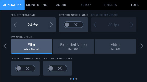 Der „Aufnahme“-Tab bietet Ihnen eine bahnbrechende, schnelle Bedienoberfläche zur Auswahl von Aufnahmeformat, Auflösung, Framerate u. v. m. Tippen Sie einfach auf Blackmagic RAW und schon leuchten die jeweiligen Optionen auf, bspw. Kompressionsverhältnisse. Treffen Sie Ihre Auswahl und wählen Sie anschließend die Auflösung. Über den „Aufnahme“-Tab justieren Sie auch den Dynamikumfang für die Modi „Film“, „Extended Video“ und „Video“. Hier bestimmen Sie auch den Cropmodus des Sensors, die Bildwechselrate, den für die Aufzeichnung bevorzugten Datenträger, den Zeitraffer, das Schärfungsniveau und mehr.