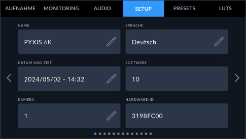 Blackmagic PYXIS sind im Nu einsatzbereit – raus aus dem Karton, einrichten und los! Über den „Setup“-Tab auf dem Dashboard stellen Sie das Datum und die Uhrzeit ein, ebenso wie die Sprache, Darstellung der Verschlusswerte, die Lichtempfindlichkeit, die Art der Stromversorgung, den Akkustand, Timecode und Weiteres. Das Verhalten der drei externen Funktionstasten der Kamera lässt sich bedarfsgemäß programmieren, um Voreinstellungen aufzurufen oder bestimmte Funktionen ein- oder auszuschalten. Sogar Ihre Live-Streaming-Optionen wie Plattform, Qualität und Server lassen sich über „Setup“ konfigurieren.