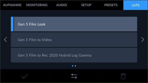 LUTs erlauben es, Bilder beim Drehen mit einem bestimmten „Look“ zu sichten. Ihren Gebrauch zeigt ein LUT-Icon oben links auf dem Display an. Wenn Sie die LUT in Ihre aufgenommenen Clips einbetten, ist das Icon blau.