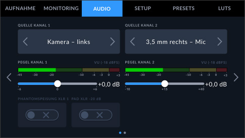 Über das interaktive HUD sind Audiopegel ruckzuck angepasst. Weitere Audioeinstellungen stehen im „Audio“-Tab auf dem Dashboard bereit. Hier können sie Toneingaben vom Kameramikrofon zu Mini-XLR wechseln, die Lautstärke für Kopfhörer, Lautsprecher, Mikrofon, Tiefpassfilter u. v. m. einstellen. In den Audioeinstellungen haben Sie die Möglichkeit, für Kanal 1 und 2 unabhängig zwischen Mikrofon- und Line-Level zu wählen. Aktivieren Sie die 48V-Phantomspeisung, um Mikrofone ohne eigene Stromversorgung zu benutzen und passen Sie die Verstärkung an.
