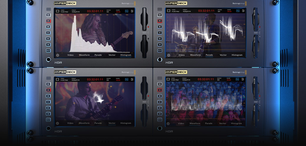 Powerful Ultra HD touchscreen HyperDeck records and plays H.265 and ProRes files in all SD, HD and Ultra HD standards up to 2160p60. Includes scopes, upgradable cache plus SDI, HDMI and analog video.