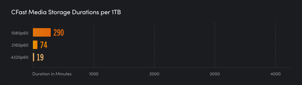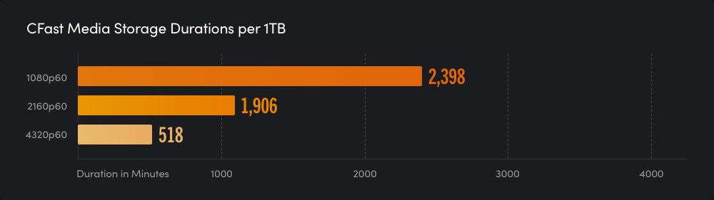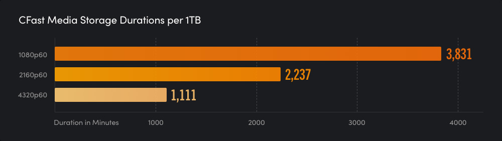 CFast media support allows you to record to commonly available flash memory cards. The H.265 files are small enough to allow long recordings on standard CFast cards. Plus there are 2 CFast card slots so you can swap out any full cards even during recording, allowing infinite length recording. CFast cards are perfect for broadcast because they are small, high speed and affordable. You can even use a Blackmagic MultiDock 10G to add SSD compatibility! With H.265, you can record up to 1,398 minutes at 8Kp60 on a 1 TB card, 3,530 minutes in 2160p60 Ultra HD and 9,446 minutes in 1080p59.94 on a 1 TB card. That’s over 23 hours in 8K and over 6 days in HD!