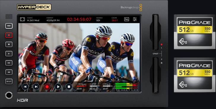 8K has 4 times as many pixels as Ultra HD so HyperDeck Extreme 8K HDR takes advantage of H.265 files for recording in 8K so file sizes are smaller and the 8K files are easy to use. H.265 files are extremely small and range from 60:1 to 285:1 compression ratios which means much lower file sizes. Plus H.265 is now supported on all major operating systems. HyperDeck Extreme even supports ProRes 422 HQ, ProRes 422, ProRes 422 LT for recording and playback plus ProRes 4444 for playback to fill and key out. This means files will be compatible with software such as DaVinci Resolve, Media Composer, Premiere Pro or Final Cut Pro .