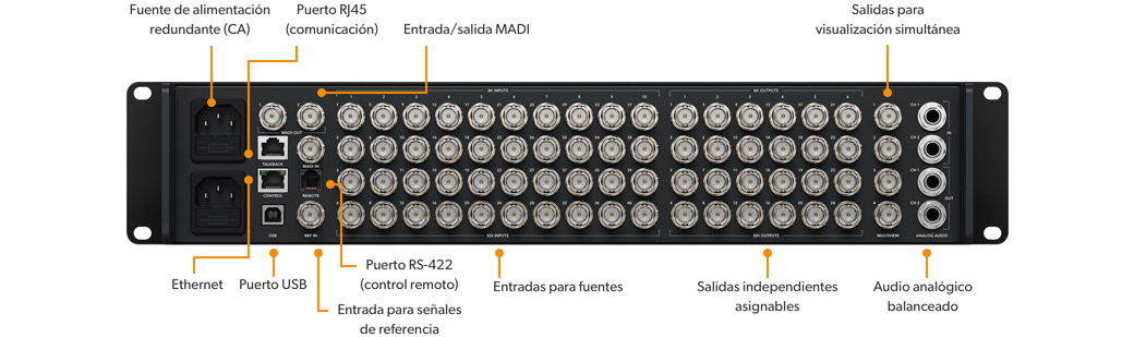 El panel trasero incluye 40 entradas SDI 12G en la parte izquierda y 24 salidas SDI 12G a la derecha. Estas conexiones se agrupan de a cuatro verticalmente para facilitar la transmisión de señales 8K, ya que estas utilizan cuatro enlaces SDI 12G. Asimismo, hay cuatro salidas para la visualización simultánea de contenidos en UHD. Por otro lado, los conectores BNC han sido específicamente diseñados por Blackmagic Design con el objetivo de permitir el uso de cables más largos y lograr una mayor confiabilidad. Uno de los problemas al realizar una producción en 8K es que no todas las fuentes tienen esta resolución. Sin embargo, cada una de las entradas SDI 12G también brinda la posibilidad de transmitir imágenes en HD o UHD y convertir el formato de la señal.