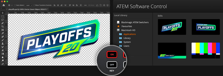 Es posible emplear cualquier programa de diseño gráfico, tal como Photoshop, para crear títulos y añadirlos a la señal transmitida. El canal alfa de la imagen permite que el mezclador superponga distintos elementos. Photoshop es uno de los programas disponibles que brinda la posibilidad de crear gráficos con canales alfa. Para utilizar un gráfico, basta con arrastrarlo a uno de los espacios disponibles del panel multimedia. A continuación, es preciso asignarlo al reproductor multimedia y seleccionar este último como fuente en los ajustes de la composición. Al activar la fuente, los títulos se superponen a la imagen transmitida.