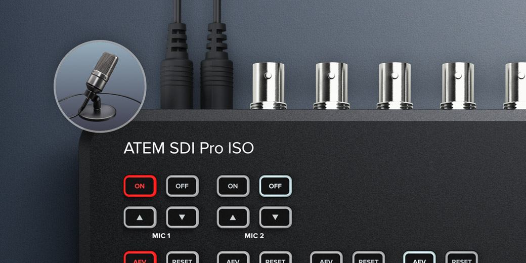 Para narrar la transmisión o realizar comentarios, basta con conectar un micrófono a cualquiera de las entradas de 3.5 mm o XLR, según el modelo. Durante las entrevistas, es posible utilizar dos micrófonos y controlar su volumen individualmente. Los botones de control del audio o el programa ATEM Software Control permiten activar o desactivar cada fuente, así como seleccionar el modo de seguimiento de imágenes. Existen varios tipos de micrófonos disponibles, desde modelos para escritorio hasta otros inalámbricos más compactos que permiten al presentador desplazarse con facilidad. El uso de micrófonos especiales junto con el programa ATEM Software Control brinda la posibilidad de ecualizar y comprimir el sonido para mejorar significativamente la claridad de la voz.