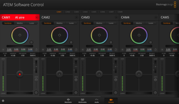 El mezclador permite controlar unidades Blackmagic Studio Camera a distancia mediante la señal de retorno transmitida a través de la salida SDI, que se conecta a la correspondiente en la cámara. A continuación, desde el programa ATEM Software Control, es posible modificar la apertura del diafragma, por ejemplo, y ajustar la intensidad del negro, al igual que en una unidad de control de cámaras. Además, incluye opciones para modificar el tinte, con propósito de lograr una homogeneidad cromática en todas las unidades, así como el enfoque, la ganancia o la velocidad de obturación. Para acceder a las herramientas de corrección de DaVinci, basta con hacer clic en el ícono correspondiente.