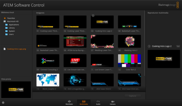 Espacio para guardar y organizar hasta 20 imágenes RGBA que pueden emplearse en transiciones, logotipos y tercios inferiores.