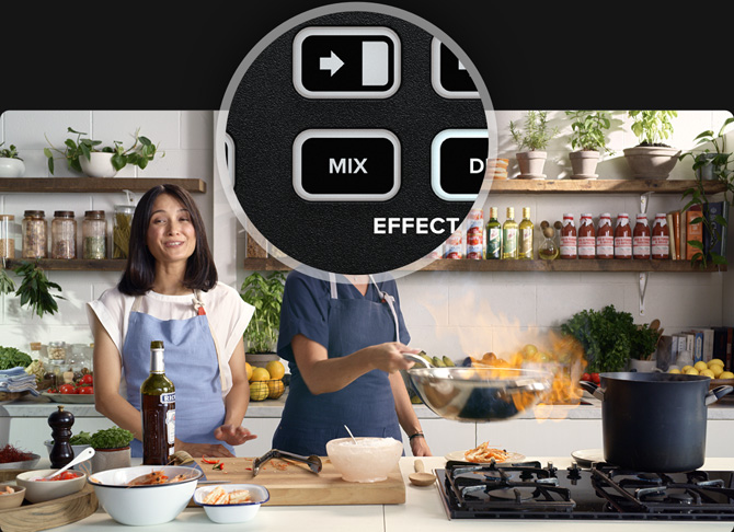 Una vez conectadas las cámaras, basta con presionar los botones correspondientes a cada entrada para alternar entre ellas mediante cortes directos. Para realizar una transición, solo es preciso oprimir el botón AUTO antes de seleccionar la fuente. El dispositivo también incluye un botón para efectuar cortes directos, ya estos se emplean con frecuencia durante una emisión. Es posible cambiar el tipo de transición presionando uno de los botones situados arriba del botón AUTO, a efectos de seleccionar disolvencias, fundidos, transiciones animadas o cortinillas verticales y horizontales, por ejemplo. En este sentido, cabe destacar que el programa ATEM Software Control ofrece una mayor variedad de opciones.