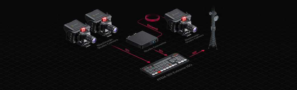 Conecte múltiples unidades Blackmagic Studio Camera 4K Pro para producir los mejores informativos locales, televisión universitaria, noticias de actualidad y programas de entrevistas. Estos modelos cuentan con todas las herramientas de una cámara de estudio tradicional, por ejemplo, una pantalla grande con luz indicadora integrada, en un diseño compacto sumamente fácil de usar. El visor de 7 pulgadas facilita el seguimiento y el encuadre de tomas, y hasta permite emplear accesorios para el control del enfoque y la distancia focal, a fin de ajustar el plano sin sacar las manos del trípode. Además, es posible conectar las cámaras mediante tecnología SDI o añadir el dispositivo Blackmagic Studio Converter para conectarse vía Ethernet 10G, a fin de obtener los mismos beneficios de la fibra óptica de manera mucho más económica.