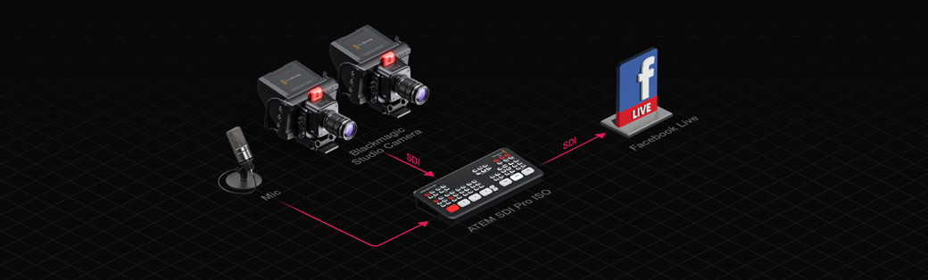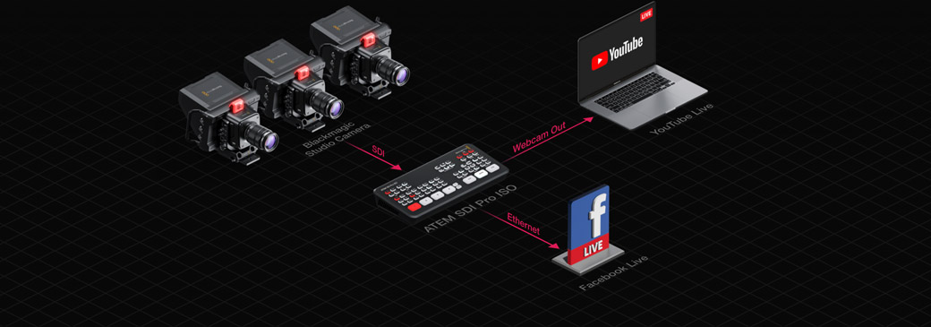 Los modelos de la línea ATEM SDI facilitan la creación de producciones profesionales, ya que ofrecen todas las prestaciones de otros mezcladores de mayor tamaño, y su configuración es muy simple. Basta con conectar algunas cámaras para comenzar a transmitir en vivo. Se pueden usar distintas prestaciones, tales como efectos visuales digitales en entrevistas, si es necesario superponer imágenes. Además, este modelo ofrece un sinfín de herramientas adicionales. Los modelos ATEM SDI cuentan con un puerto USB que permite reconocerlos como una cámara web, por lo cual son compatibles con cualquier programa para transmitir por Internet. Por otro lado, las versiones ATEM SDI Pro y Extreme brindan la posibilidad de hacerlo mediante el puerto Ethernet o directamente desde un teléfono móvil. Incluso cuentan con entradas para micrófonos independientes, a fin de captar un sonido extraordinario durante las entrevistas.