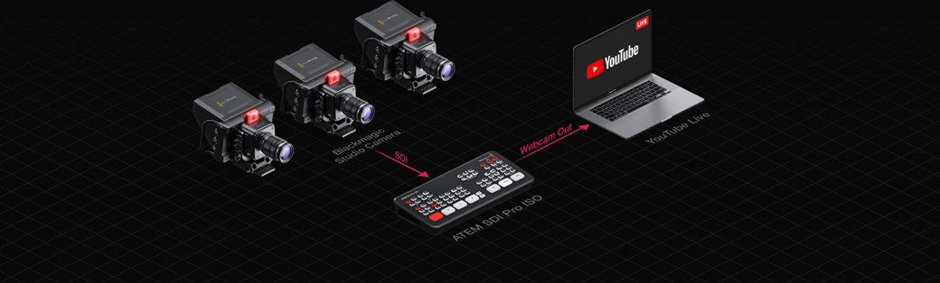 Los modelos ATEM SDI son ideales para programas de transmisión por Internet pequeños, dado que brindan la posibilidad al presentador de alternar las señales sin ayuda alguna. Gracias a sus cuatro entradas SDI, es posible conectar tres cámaras para planos cortos, medios y largos, así como un dispositivo HyperDeck Studio, a fin de reproducir clips grabados con anterioridad. Los efectos visuales digitales permiten crear efectos profesionales con imágenes simultáneas, sombras paralelas y bordes adaptables, lo cual resulta de utilidad para mostrar reacciones de la persona entrevistada. Además, al agregar logotipos y tercios inferiores, el programa adquiere una apariencia profesional. La transmisión puede llevarse a cabo mediante el puerto USB de un equipo informático o directamente desde los modelos ATEM SDI Pro y ATEM SDI Extreme.
