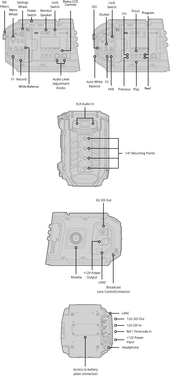 Controlador lateral con botones integrados para el modelo URSA Mini Pro que permite iniciar o detener la grabación y ajustar el enfoque y el diafragma. Roseta estándar y puerto LANC para colocarlo en el lateral de la cámara o en la parte frontal al emplear el soporte para el hombro.