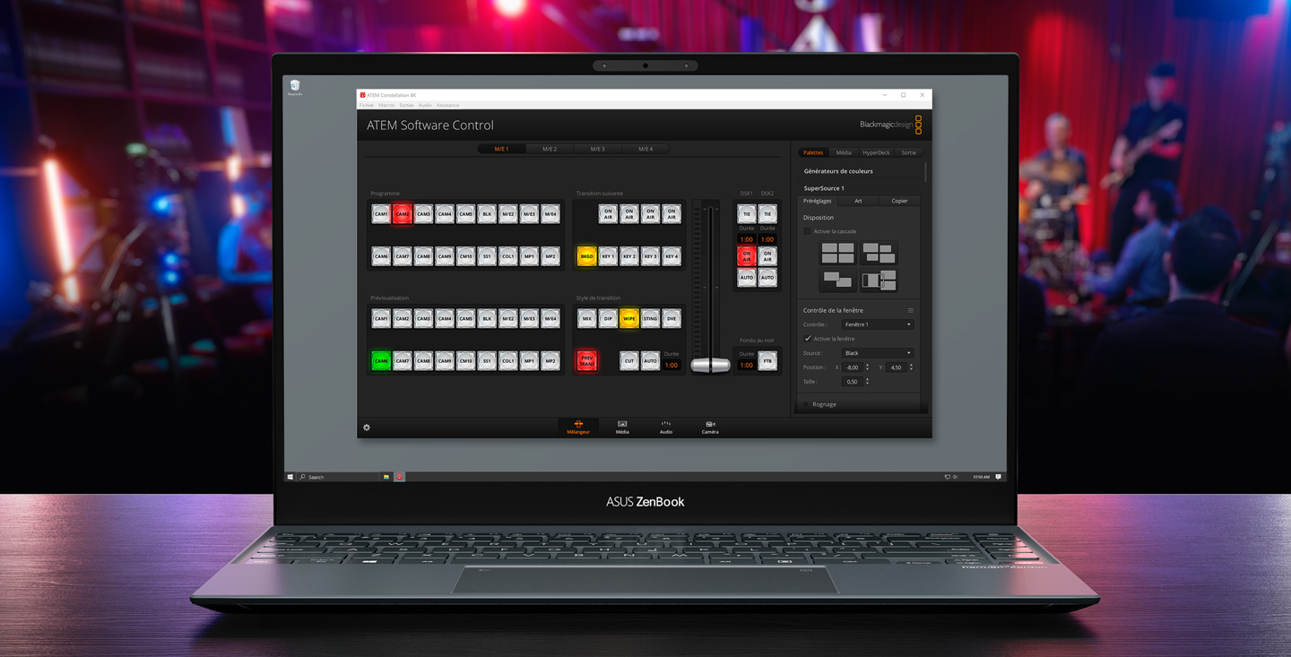 L'ATEM Constellation 8K peut être contrôlé directement sur le panneau avant ou avec le logiciel gratuit ATEM Software Control sur Mac ou Windows. L'ATEM Software Control offre davantage d'outils de contrôle qui vous permettent d'être encore plus créatif. Il permet de commuter les sources en direct, de charger des graphiques dans la bibliothèque de médias, d’utiliser des transitions et des incrustations, mais aussi de modifier les paramètres du mélangeur et de mixer l'audio. Pour les productions en direct de grande envergure, vous pouvez même utiliser plusieurs logiciels pour que plusieurs personnes travaillent ensemble sur la même émission.