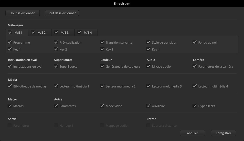 L’ATEM Constellation 8K vous permet de sauvegarder la configuration de votre mélangeur à n'importe quel moment et de la rappeler en mémoire instantanément. L’état du mélangeur est sauvegardé dans un fichier XML, que vous pouvez modifier. Si vous commencez à utiliser un ATEM Constellation 8K, vous pouvez utiliser les configurations XML créées sur les autres mélangeurs ATEM, dont l’ATEM Mini. Les fichiers sont compatibles entre les différents modèles ! Vous pouvez sauvegarder l’état du mélangeur à n’importe quel moment, ou régler l’ATEM Software Control pour effectuer des sauvegardes automatiques régulières, en conservant les anciennes versions. Lorsque vous sauvegardez l’état du mélangeur, vous conservez tous les réglages mais également le contenu de la bibliothèque de médias.