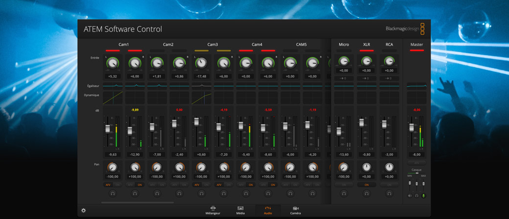 Grâce à son mixeur audio Fairlight intégré, l’ATEM Television Studio HD permet de réaliser des mixages audio en direct complexes. Le mixeur interne dispose de suffisamment de canaux pour toutes les entrées SDI, et de canaux supplémentaires pour les entrées XLR, RCA et MADI. Chaque canal d’entrée est doté d’un égaliseur paramétrique à 6 bandes, d'un compresseur, d'un limiteur, d'un expanseur et d'un noise gate, ainsi que du panoramique. Vous pouvez mixer tous ces canaux d'entrée ensemble en même temps, ou régler les sources vidéo sur « Audio Follow Video ». Le mixeur audio est extrêmement puissant et peut être réglé depuis le panneau avant à l'aide des commandes dédiées et de l'écran LCD. Vous pouvez aussi utiliser l’ATEM Software Control.