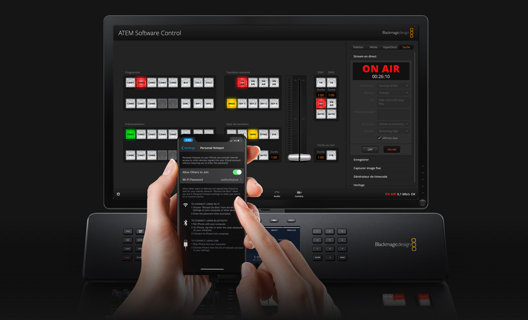 Si vous faites de la production en direct sur site, l’ATEM Television Studio HD supporte la connexion à un smartphone Apple ou Android via le port USB. C’est aussi un excellent backup pour la connexion Ethernet principale. Les téléphones 5G les plus récents et les 4G les plus courants sont compatibles. Le mélangeur détecte lorsqu'un téléphone est connecté et bascule automatiquement sa connexion Internet pour l'utiliser si la connexion Ethernet est perdue. Le téléphone connecté sera alimenté via le port USB et sera donc toujours chargé et prêt à l’emploi. Avec le partage de connexion et les données mobiles, vous disposez d’une solution de production mobile parfaite et utilisable n'importe où !