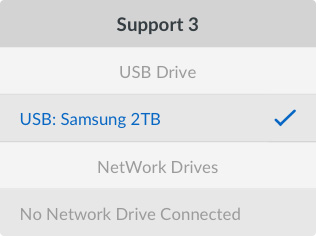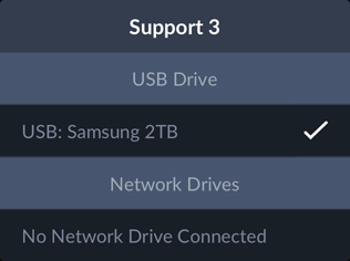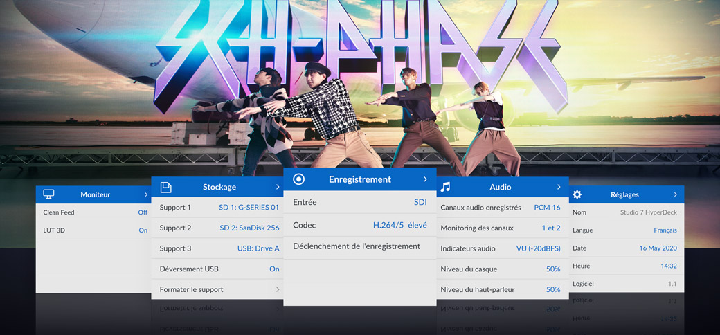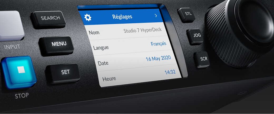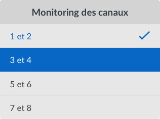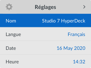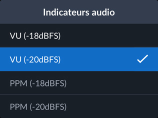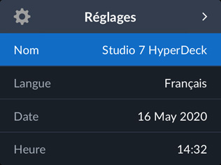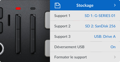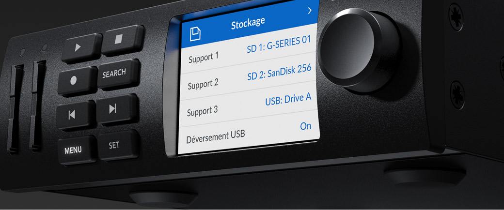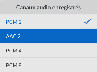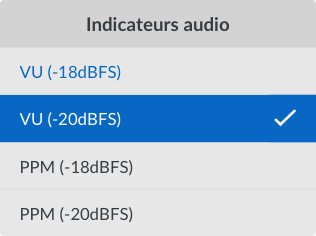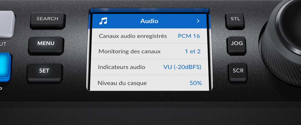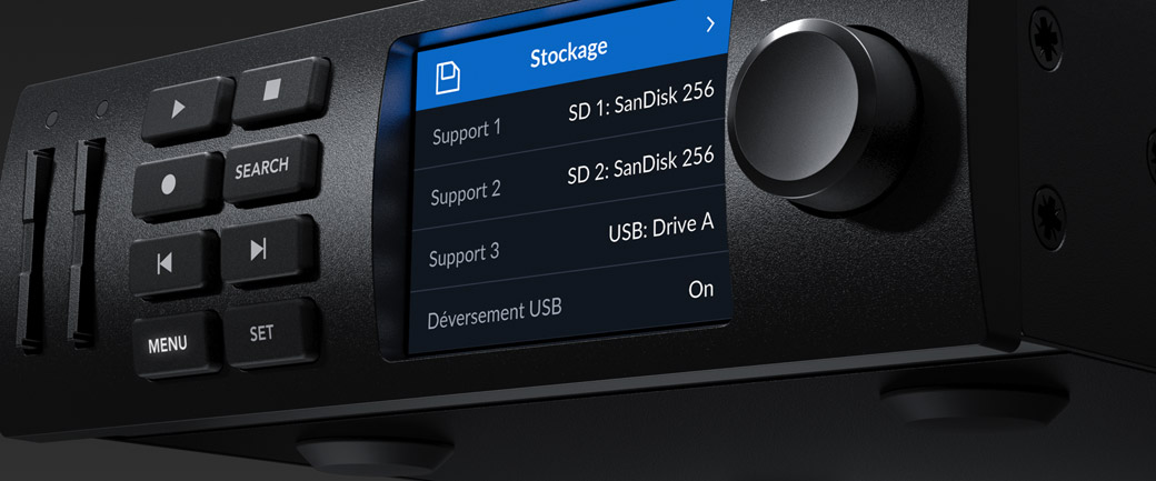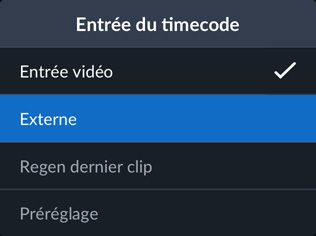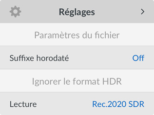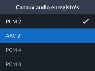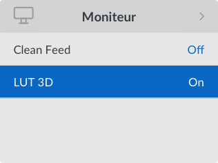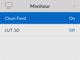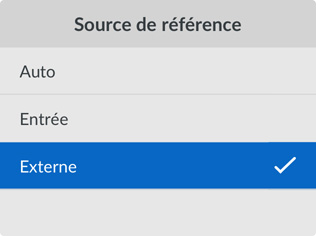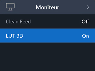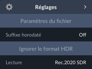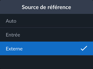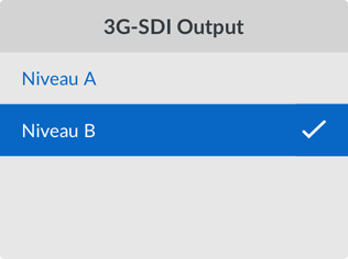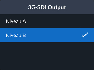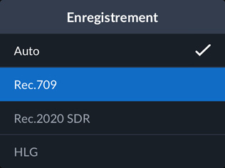 Le menu Entrée permet de sélectionner des sources HDMI ou SDI pour l’enregistrement. Vous pouvez aussi appuyer sur le bouton Input à l’avant pour basculer entre les sources HDMI et SDI. L’entrée sélectionnée est affichée sur la sortie de monitoring.