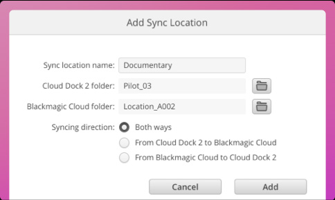 Next you need to set the sync folders. That tells the Blackmagic Cloud Dock where to sync its files to the Blackmagic Cloud. You can have multiple sync folders for different jobs!