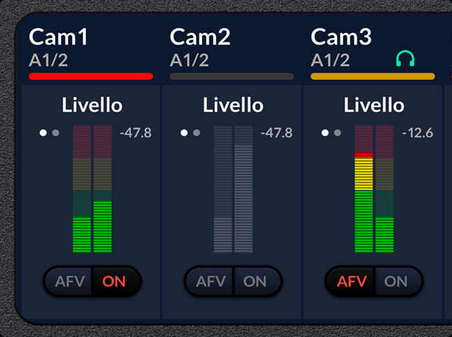 Questa è la sezione principale dove selezionare livelli, panning, equalizzazione, compressione, limitazione, noise gate, espansione e persino il controllo camera.