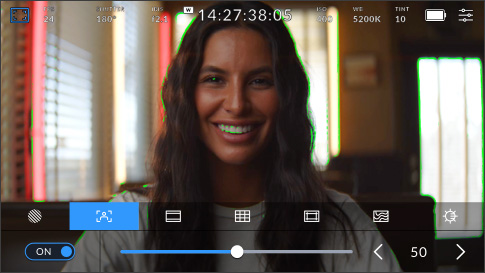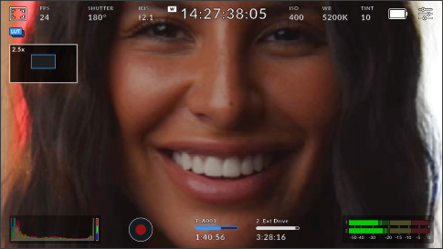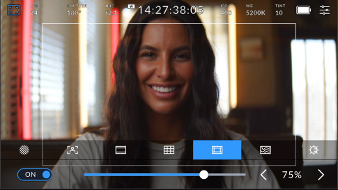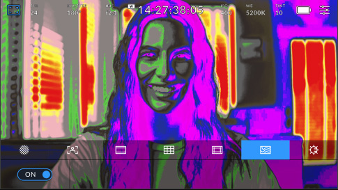 La tab Monitor offre un controllo completo delle immagini visualizzate sul touchscreen LCD e sull'uscita HDMI. Ogni uscita può avere i propri overlay. Per esempio, puoi inviare il clean feed o applicare zebra, focus assist e guide di inquadratura a una o a tutte le uscite, così come impostare la risoluzione e scegliere le LUT. Per di più hai l’opzione di scegliere il testo da visualizzare, così il direttore della fotografia o la regista potranno ricevere le informazioni a loro utili attraverso l’uscita HDMI.