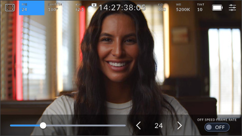 Il display HUD mostra in sovraimpressione le informazioni principali, tra cui frame rate, diaframma, timecode, angolo dell’otturatore, bilanciamento del bianco, ISO e livelli audio. Per vedere o nascondere il display HUD basta passare il dito verso l'alto o il basso. Per esempio puoi cambiare il bilanciamento del bianco toccando l’icona WB o regolare l’audio toccando gli indicatori di livello. Ogni elemento del display è interattivo, per gestire le impostazioni all’istante invece di navigare menù complicati.