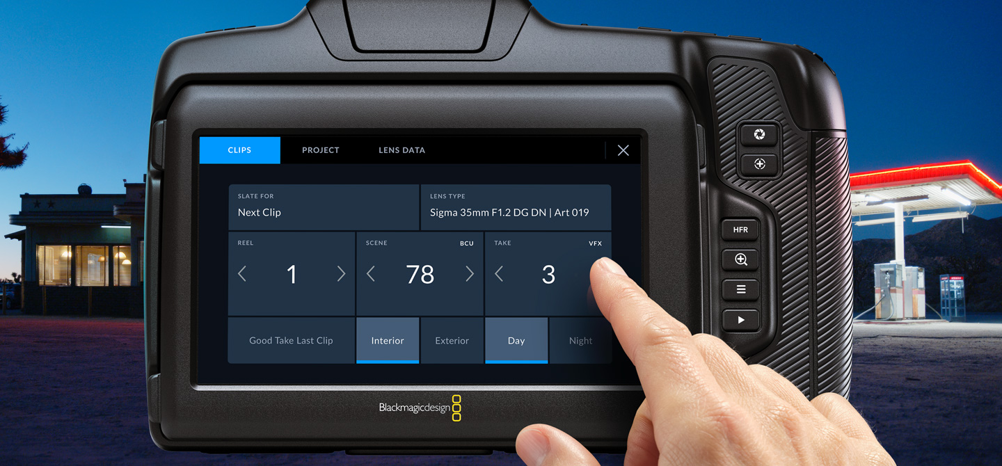 Il ciak digitale di Blackmagic Cinema Camera offre straordinarie funzioni che ottimizzano l'inserimento dei metadati di ripresa. Per visualizzarlo basta muovere il dito verso destra o sinistra sullo schermo. Inoltre quando avvii e interrompi la registrazione, puoi impostarlo di modo che incrementi automaticamente il numero del ciak, così non devi cambiarlo tu di volta in volta. I metadati degli obiettivi elettronici vengono letti di default, o si possono inserire manualmente insieme ad altre informazioni specifiche, tecniche e non solo. Tutti i metadati vengono salvati con i rispettivi file e sono accessibili in post produzione per il montaggio e la correzione colore sui software come DaVinci Resolve.