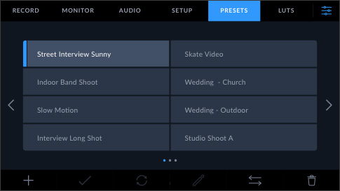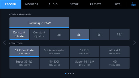 La dashboard di Blackmagic Cinema Camera ha sei tab con interfacce eleganti e di facile utilizzo che danno accesso immediato a tutte le funzioni e alle impostazioni della camera. Nelle tab Record, Monitor, Audio, Setup, Preset e LUT gestisci ogni opzione con un tocco del dito. Il design ricercato dell'interfaccia organizza le voci in modo logico e intuitivo per imparare subito dove sono le impostazioni e come modificarle.