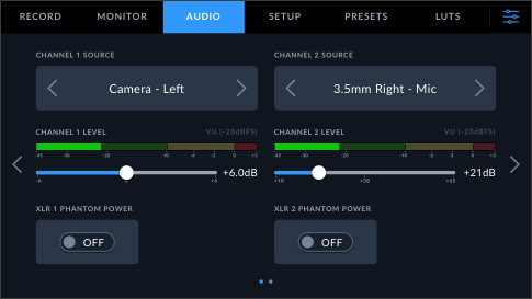 Regola i livelli audio direttamente dal display HUD interattivo, oppure apri la tab Audio della dashboard per accedere ai controlli completi. Puoi scegliere l'ingresso del microfono della camera o quello XLR mini, regolare i livelli delle cuffie, dello speaker e del microfono, il filtro low cut e altro ancora. Le impostazioni per l’audio in entrata consentono di selezionare i livelli microfonici o di linea per il canale 1 e 2 separatamente, abilitare l'alimentazione phantom di 48V per i microfoni senza alimentazione propria e regolare il gain.