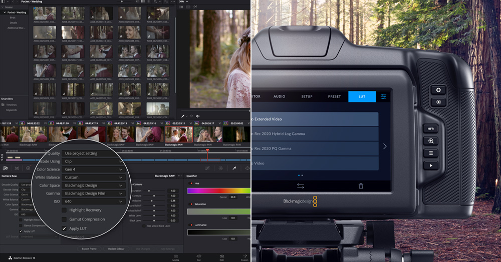 Blackmagic RAW offre diverse opzioni per usare le LUT in modo non distruttivo. Le LUT 3D si possono integrare come metadati direttamente nel file .BRAW per visualizzare le immagini con il look desiderato, oppure salvare nei file .sidecar che accompagnano i file .BRAW. La LUT salvata nel file .sidecar subentra automaticamente alla LUT integrata. Poi basta rimuovere il file .sidecar per ritornare subito alla LUT integrata. Sui software come DaVinci Resolve Studio accedere alle LUT 3D per il montaggio e la correzione colore è facilissimo perché sono sempre associate al file BRAW. DaVinci Resolve è anche in grado di salvare le correzioni colore come LUT 3D, consentendo di creare LUT su misura nel formato .cube per una creatività senza limiti!