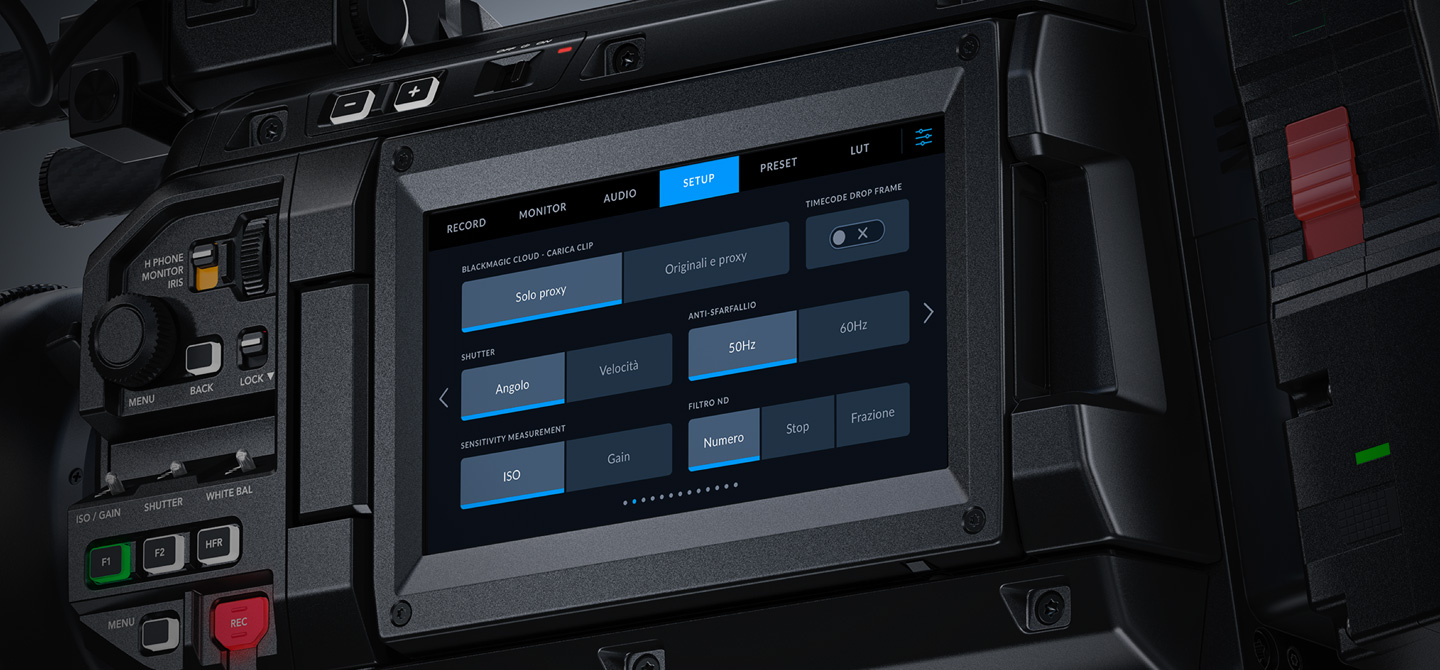 URSA Cine consente di abilitare e disabilitare vari strumenti di monitoraggio toccando la loro icona sul monitor e di regolarli grazie alle opzioni su schermo. Tra le altre, puoi definire le impostazioni di vari strumenti: zebra per controllare esposizione o grigio medio, focus assist, guide e griglie.