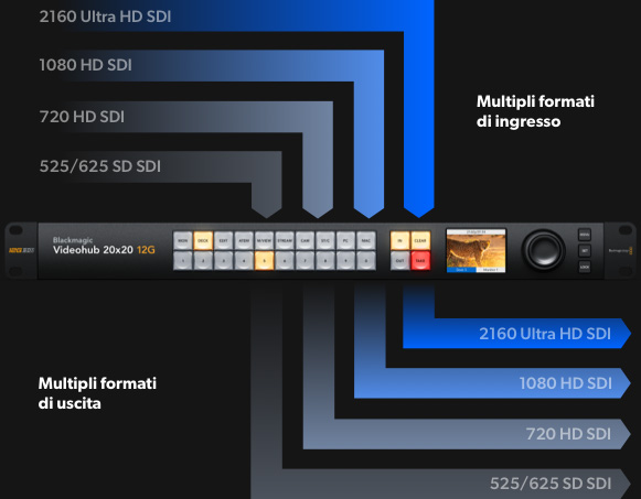 Tutti i modelli Blackmagic Videohub 12G ospitano avanzate connessioni 12G-SDI multirate compatibili con qualsiasi formato video SD, HD e Ultra HD fino al 2160p60 che si collegano a qualsiasi dispositivo SD, HD-SDI, 3G-SDI, 6G-SDI e 12G-SDI. Non solo, Blackmagic Videohub 12G può instradare qualsiasi standard video in simultanea. Significa che con il modello da 120 puoi instradare 120 segnali video differenti su 120 uscite allo stesso tempo! Il 12G-SDI ammette l'Ultra HD ad alto frame rate tramite una singola connessione BNC e si collega alla strumentazione HD che già possiedi. Con il 12G-SDI la tua tecnologia è a prova di futuro!