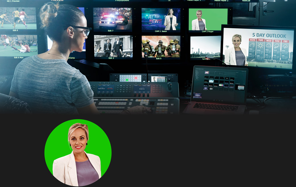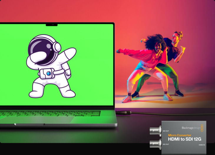 ATEM ConstellationにCGを接続する必要がある場合、Micro Converter HDMI to SDIを使用します。直接接続でき、完全にデジタルなので、素晴らしい品質が得られます!グリーンバック用のグラフィックを作成すると、ATEM Advanced Keyerでライブバックグラウンドにタイトルを合成できます。コンピューターは、メディアプレーヤーとしても使用できます。